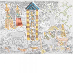 He then worked as a winegrower at his parents’ farm. His hallucinations brought him to the psychiatric clinic in Gugging. From 1982 until his death in 2008, he lived at the House of Artists, where he created art for the first time. Initially, he would paint a figure, such as a person or animal, with a pencil and a few coloured pencils. His drawings became more colourful over time and he later created complex image compositions that he often “inscribed” with imaginative words. He portrayed subjects such as agriculture, life at the countryside and social interactions. He was very disciplined in his work, which he always pursued weekdays between breakfast and lunch. Johann Fischer was communicative, liked to visit the openings of his own exhibitions and would discuss his images with visitors.